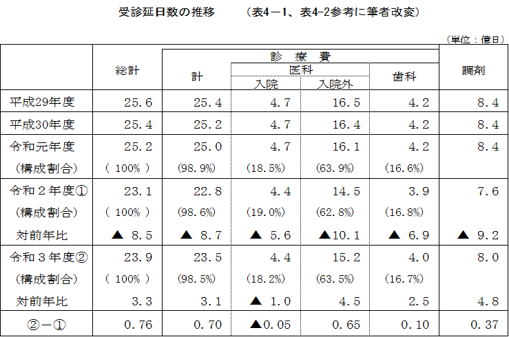 この報告からも、令和2年度の新型コロナウイルス感染症による受診控え等から大幅な改善傾向がみられるものの、特に入院ではまだその影響があること、受診延日数が減少を続けている点は、入院では平均在院日数の短縮、そして入院外では処方日数の長期化(特に新型コロナウイルス感染症によって長期処方の傾向は伸長したと考えられます)が影響をしているのではないでしょうか。